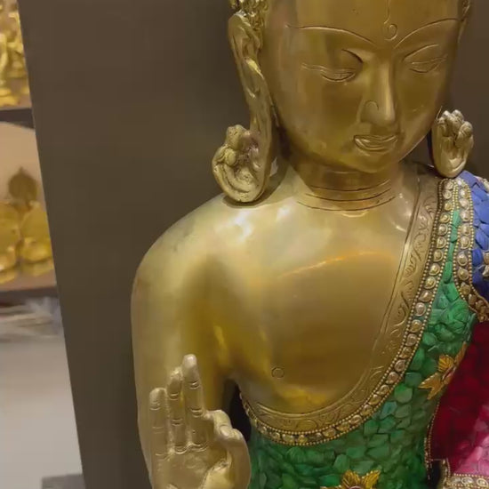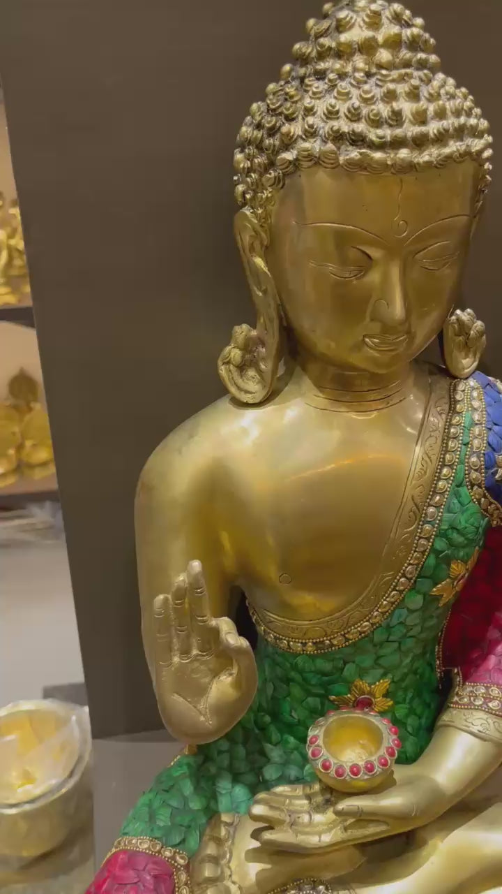 Bring peace, positivity, and spiritual energy into your home with this beautiful Brass Stone Work Buddha Idol, handcrafted with colourful gemstone inlay detailing. This Meditation Buddha statue, with its calm expression and Abhaya Mudra (protection gesture), is perfect for creating a serene atmosphere in your living room, meditation corner, home temple, office, or yoga space.