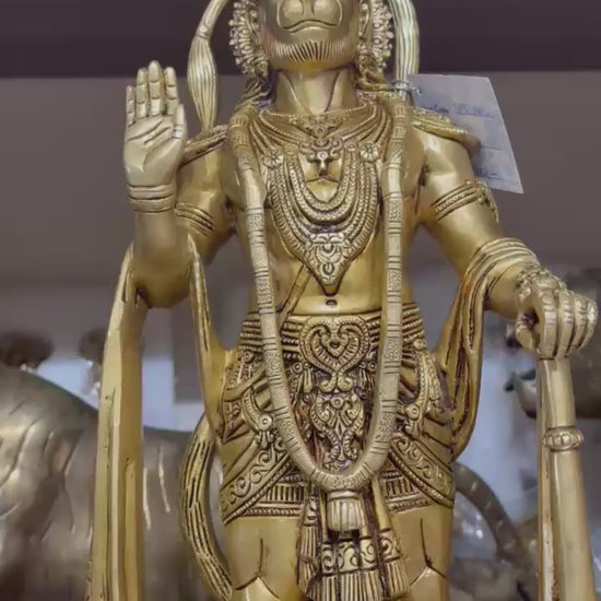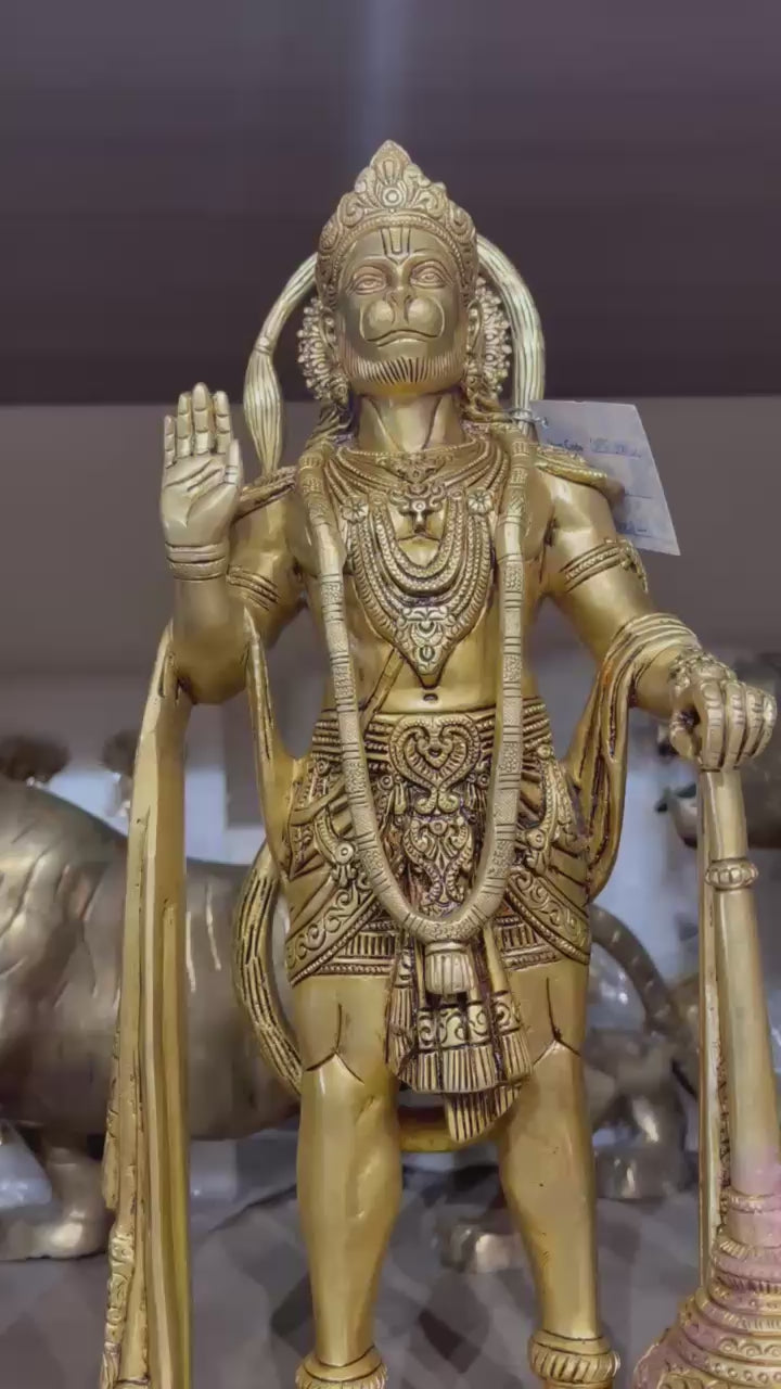 Expertly handcrafted from pure brass, the idol showcases Lord Hanuman in a majestic standing posture holding his powerful Gada (mace), symbolizing unwavering strength and faith. The intricate carvings, detailed ornaments, and antique finish make this sculpture a true collector’s piece, perfect for enhancing the spiritual aura of your home, office, or temple.