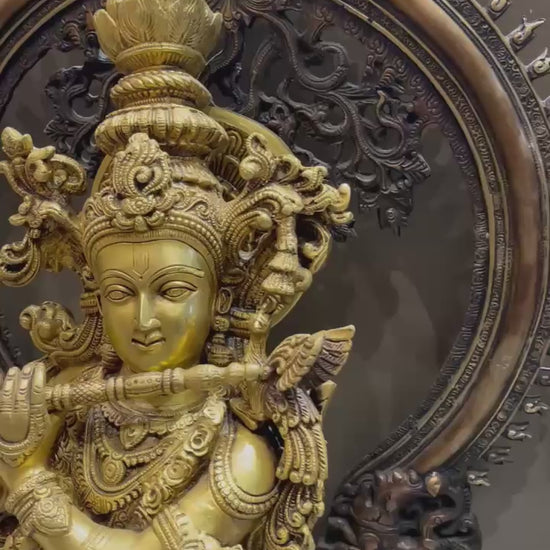 Embrace divine harmony and timeless elegance with this magnificent Brass Lord Krishna Idol, beautifully depicting Venugopala, Lord Krishna playing the flute in his enchanting form. Handcrafted from pure brass with stunning antique detailing, this flute-playing Krishna statue radiates love, prosperity, and spiritual bliss, making it an ideal centerpiece for your home temple, living space, or office decor.