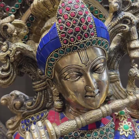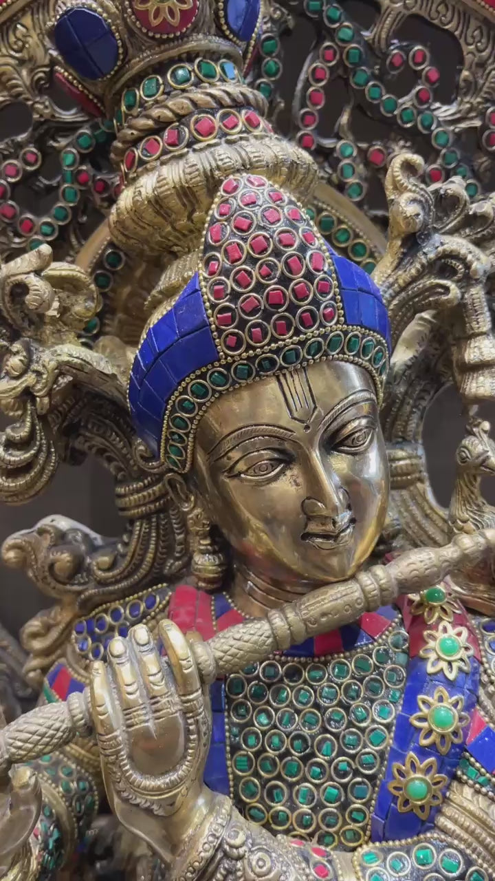 Embrace divine beauty and eternal grace with this exquisite Brass Lord Krishna Idol, featuring Venugopala, Lord Krishna playing the flute in a captivating pose. Adorned with intricate turquoise, coral, and lapis gemstone inlay work, this stone-studded brass Krishna statue radiates love, peace, and prosperity, making it a perfect centerpiece for your home temple, living room, or spiritual decor.