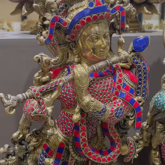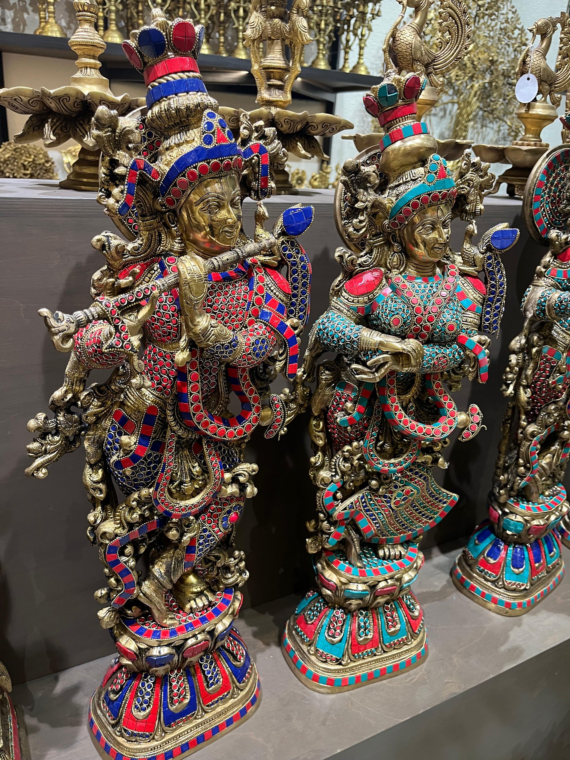 Brass Radha Krishna Stone Work Idol Pair | Handcrafted stone Inlay Statues for Home Temple (30 Inches)